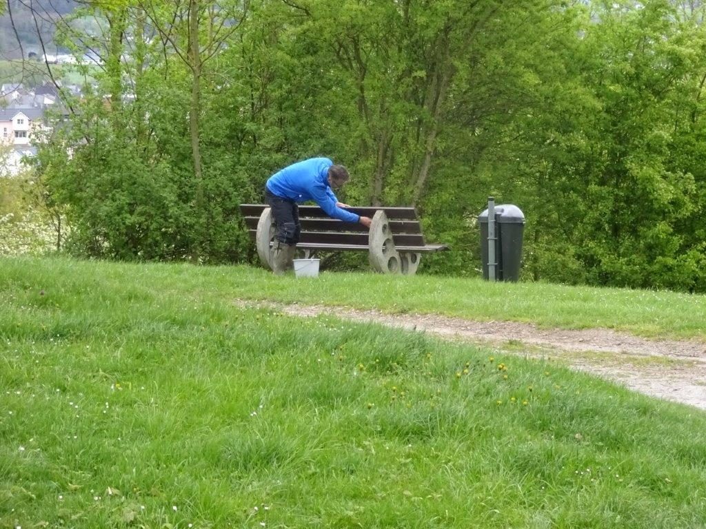 Befestigung des Abfalleimers am neuen Sitzplatz – Bepflanzung der Vereinskästen – Instandsetzung des Grillplatzes